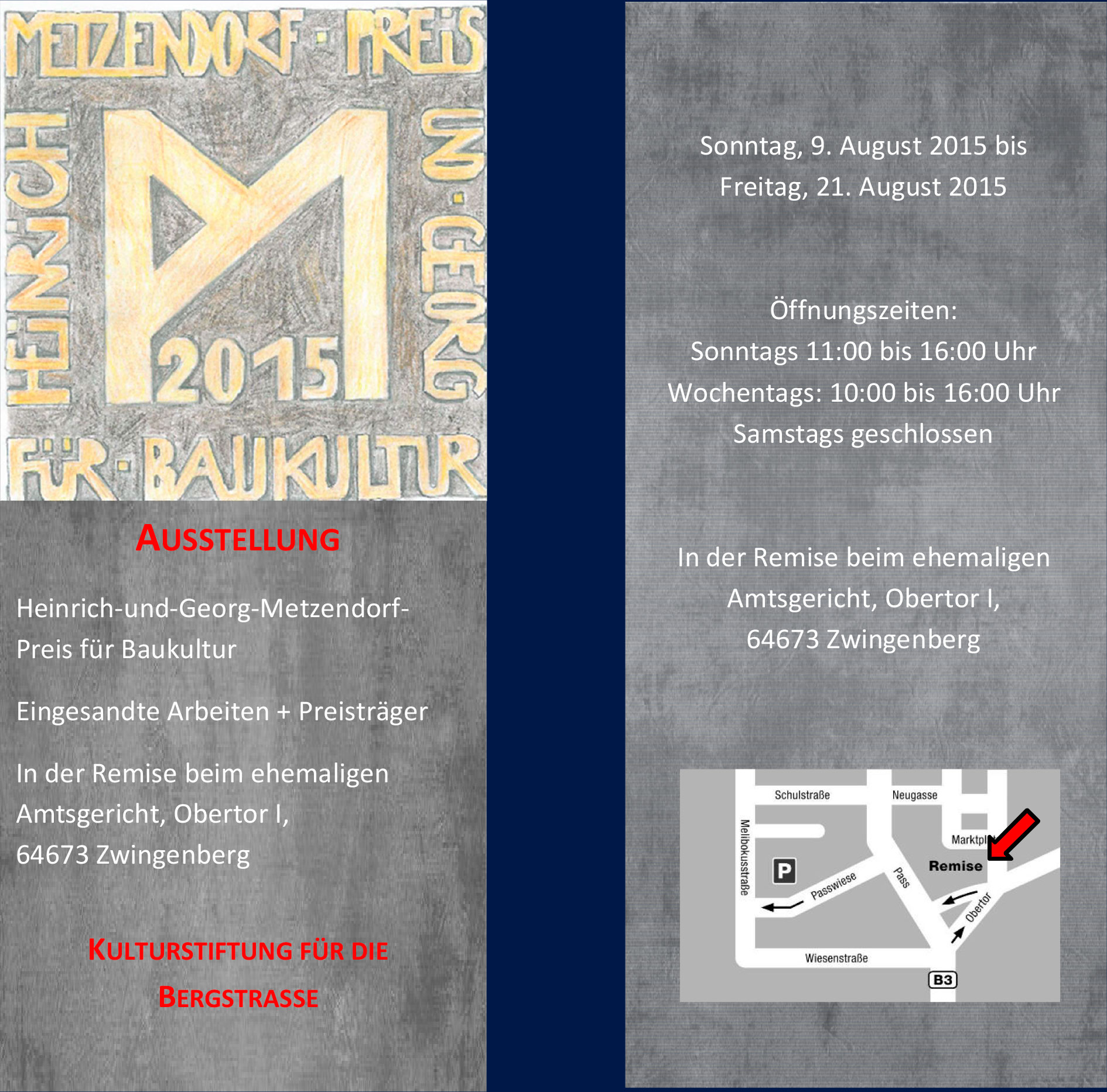 Mit der Auszeichnung soll die Qualität der gegenwärtigen Baukultur an der Bergstraße gefördert werden. In direktem Bezug zu den Namensgebern Heinrich (1866 - 1923) und Georg (1874 - 1934) Metzendorf, die mit ihrer Arbeit an der Bergstraße und an anderen Orten, etwa der Siedlung Margarethenhöhe in Essen, eine qualitätsvolle als auch landschaftsbezogene Architektur realisierten, stand die diesjährige Ausschreibung unter dem Thema „Neues Leben für alte Mauern“: Gesucht wurden Objekte im Bereich „Bauen im Bestand“, d.h. Anund Umbauten, Sanierungen und Restaurierungen von Gebäuden und Ensembles im Zuge von Umnutzungen, baulichen Veränderungen oder auch Erweiterungen.